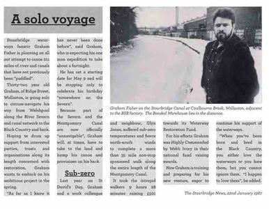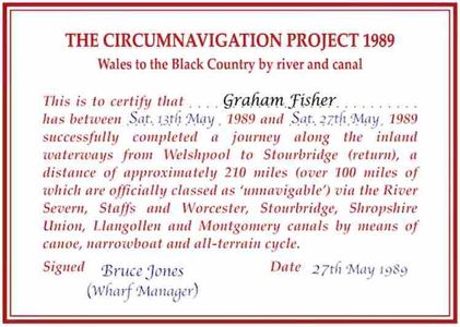 The follow-up project to the walk of 1986, this sought to establish the possible link between Wales and the Black Country in a circular route. With no records of it being attempted previously or since, the event is, as with the walk of '86, unique. A token 'cargo', a lump of coal mounted in a display case, was carried along the entire journey and subsequently gifted to Stourbridge Navigation Trust. A larger legible image is in Pics.